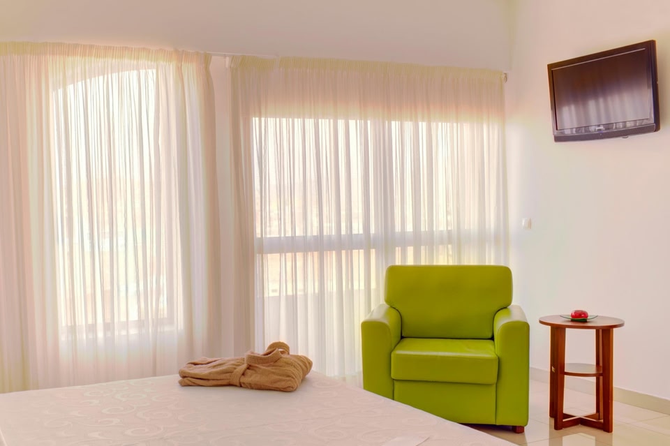 Surrounded by mountains, this air-conditioned hotel in the centre of Mindelo, is a 10-minute drive from San Pedro Airport. It is 400 metres from the beach and offers a restaurant and 24-hour reception.