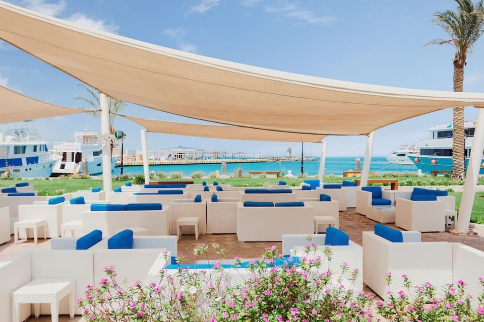 赫尔格达希尔顿广场酒店的客房可欣赏到红海的壮丽景色,酒店还设有私人沙滩和水上运动设施。